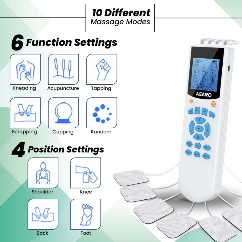• 4 Channel multifunctional tens massager,10 Massage modes for pain relief recommended for muscle spasms caused by various condition like arthritis, period pain, knee pain, neck pain, back pain, and multiple sports injuries