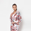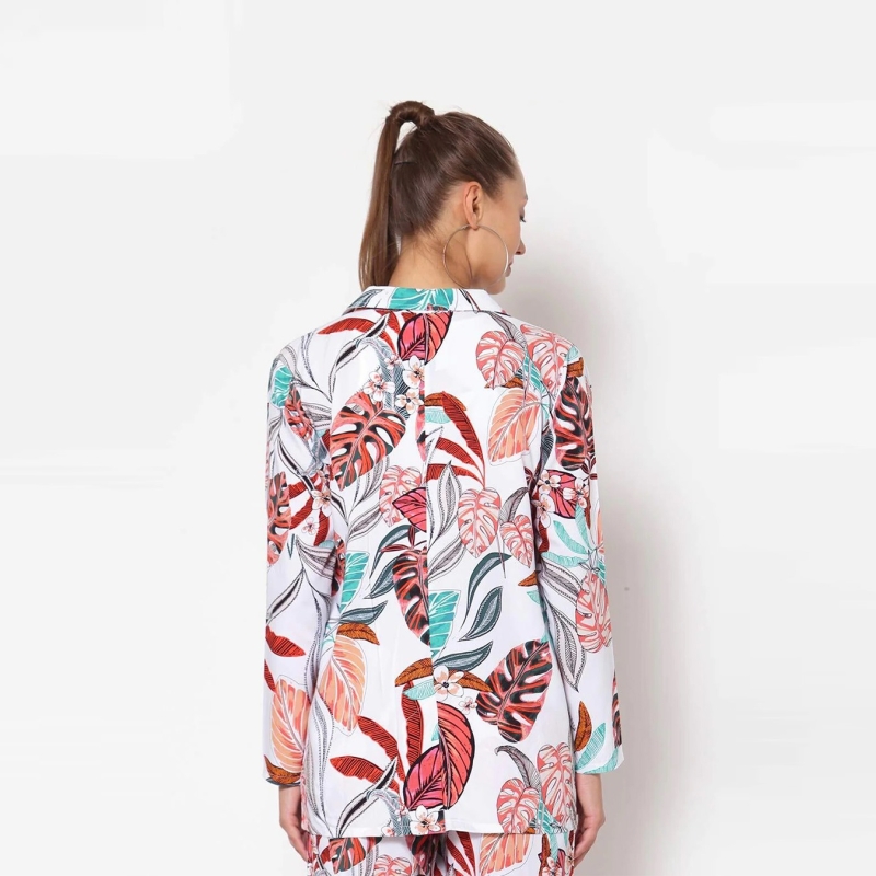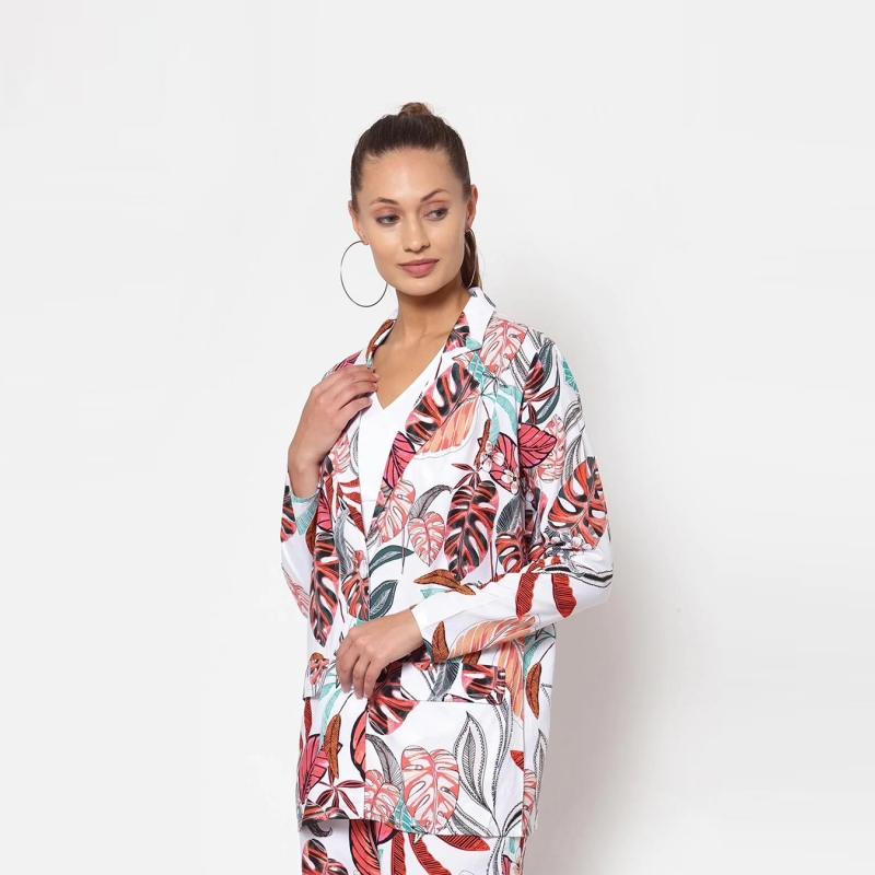 بليزر أبيض مطبوع بالورود بصدر واحد، بياقة طية صدر مسننة، أكمام قصيرة