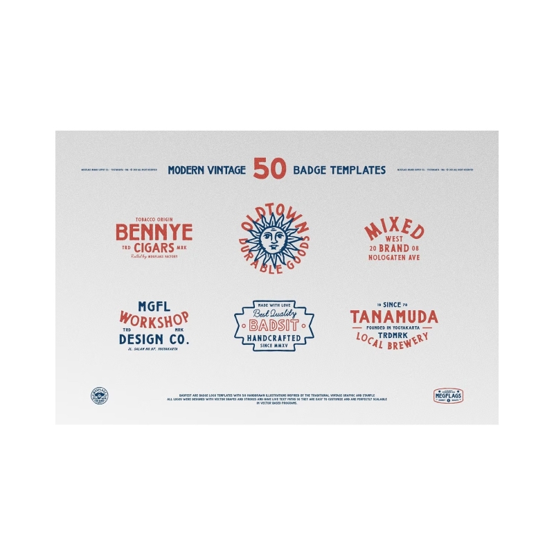 Badfest son plantillas de logotipos de insignias con 50 ilustraciones dibujadas a mano inspiradas en el gráfico y el sello vintage tradicional. Todos los logotipos fueron diseñados con formas vectoriales y trazos y tienen rutas de texto en vivo para que sean fáciles de personalizar y sean perfectamente escalables en programas basados en vectores.