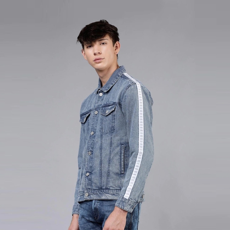 Blue washed denim jacket, has a spread collar, 2 pockets, button closure, long sleeves, straight hem, unlined lining and has chest mock pockets.