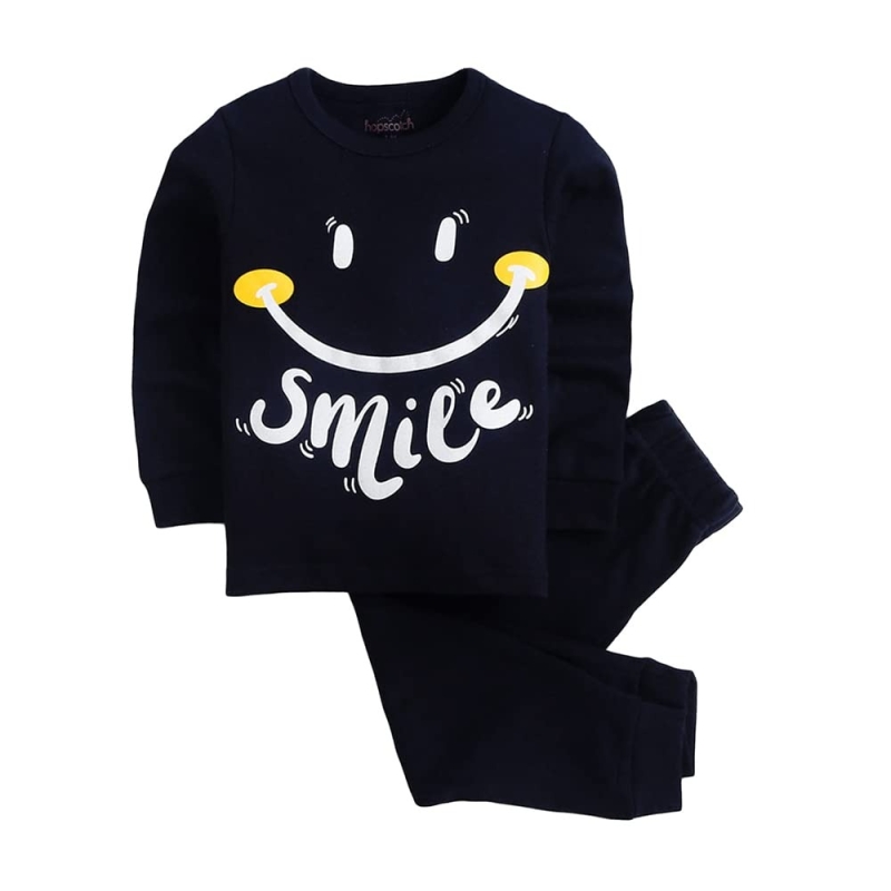 Hopscotch Boys Cotton Solid Text Print Top and Pajama Set in Navy Color