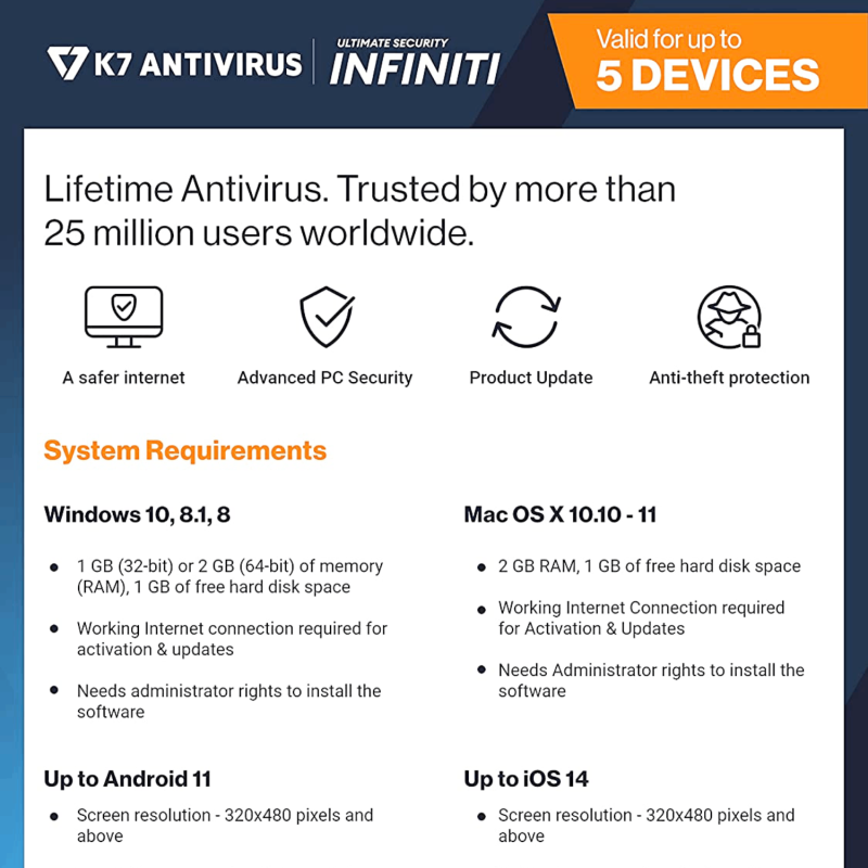 • Lifetime Protection : Safeguards your laptop, PC’s, Macs, tablets and smartphones against Viruses, Malware, ransomware, Spyware, Phishing and ensures secure browsing for lifetime