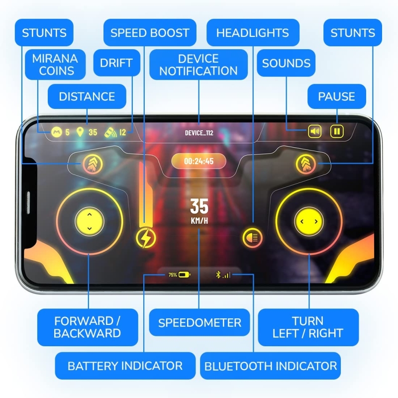 • App Control: Move the Racing Car vehicle forward, backward, left and right through the Mirana App. The App also allows you to enjoy the Nitro Booster, background music and other features just like playing a Mobile Game.
