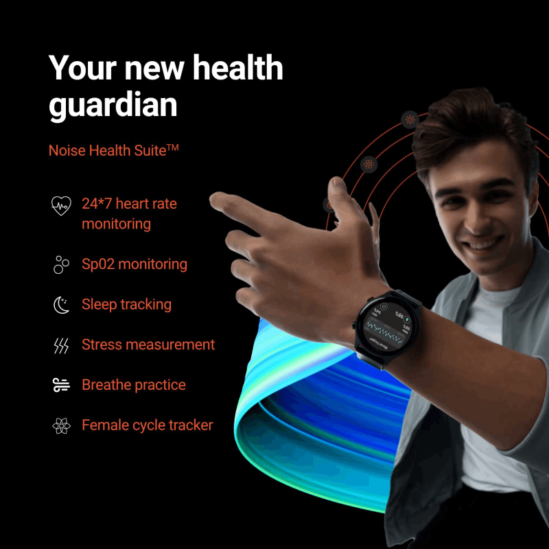 • Noise Health SuiteTM: Take better care of your daily health with a series of health monitoring tools – Blood oxygen monitor, Sleep monitor, 24x7 heart rate monitor, Stress measurement, Breath practice & Female cycle tracker.