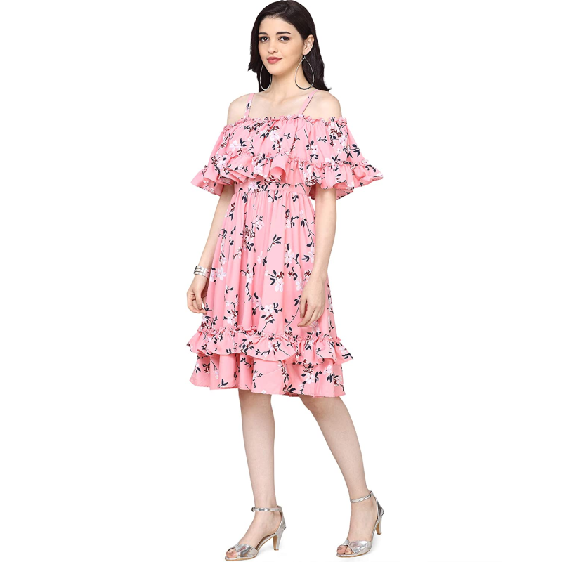 Playful pleated dress with ruffles on the hem. Off shoulder neck, with noodle straps and ruffled cape