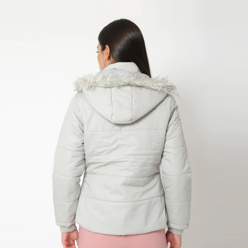 Jacket with faux fur trim, has a mock collar with hooded, 2 pockets ,has a snap button closure, sleeveless, straight hemline, polyester lining