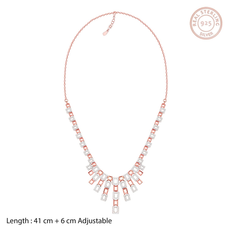 • PRODUCT DETAILS: 925 Silver with Rose Gold Plating & AAA+ Quality Zircons. Includes the Rose Gold Grace Necklace, and a pair of Rose Gold Grace Earrings . Rhodium e-coat to prevent tarnish. Earrings: 12mm*40mm, Necklace: 41 Cms +6 cms, Adjustable