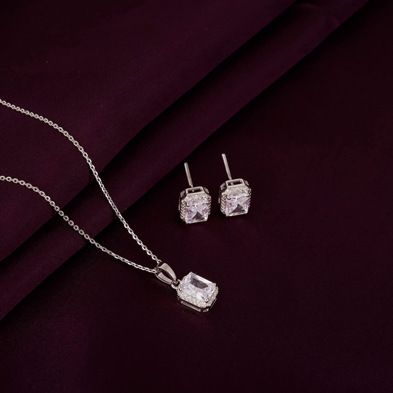 • PRODUCT DETAILS : Made of 925 Silver, Contains a pendant with a link chain and a pair of earrings, Charm: 1.9 cm x 0.85 cm, Length of necklace is 43 cm with 4 cm adjustable portion, Earring dimension: 1 cm x 0.85 cm. Rhodium finish to prevent tarnish