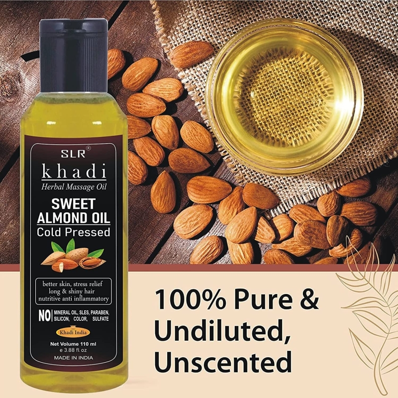 SLR Khadi Sweet almond oil is a light, non-volatile,Oil rich in vitamins and minerals. This Imparts Excellent Nutritive Soothing Anti-Inflammtory And Laxative Properties.