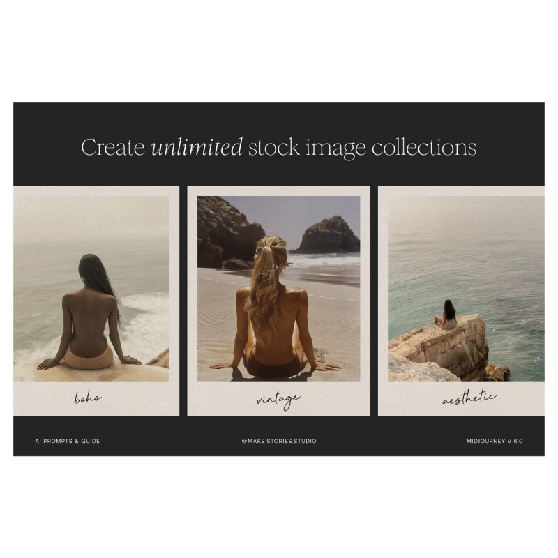Sunkissed beauties at the beach. With this collection of Midjourney prompts, we wanted to capture as much skin as possible. With warm summer days coming, this collection is designed to elevate branding with infinite content for social media, websites, advertising, and other creative projects.