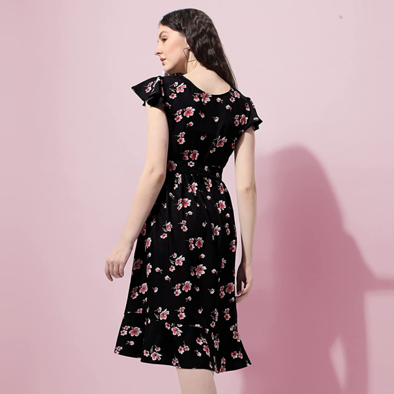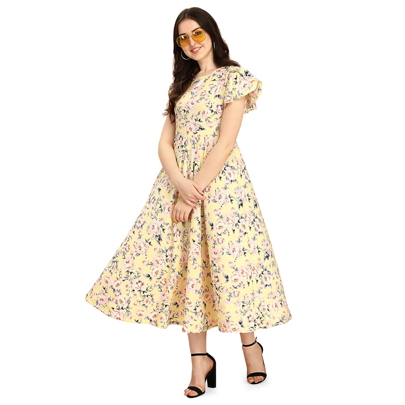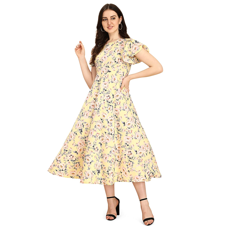 Ankle length A-line dress with butterfly sleeves and boat neck