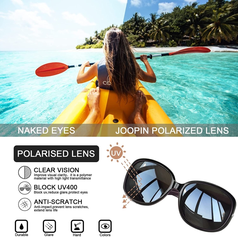 • ✔HD POLARIZED LENS - Joopin anti glare women polarized sunglasses reduce glare reflected off of roads, bodies of water, snow, and other horizontal surfaces. Joopin polarized women sunglasses can restore true color, with no distortion or deformation of color-saturated images. And if you experience headaches due to light sensitivity, polarized lenses of Joopin black sunglasses may help you experience less intense headaches. Joopin always protect your eyes perfectly