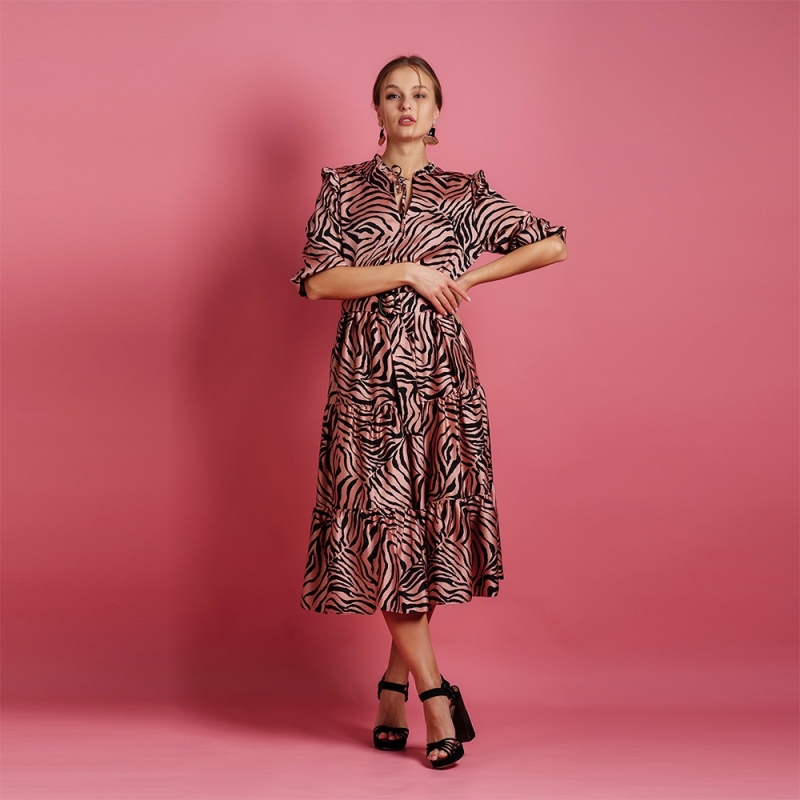 Pink printed women A-line dress, has a round neck, three-quarter sleeves, an attached lining, and flared hem
